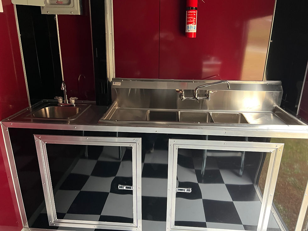 ELECTRIC WATER PUMP BURGUNDY METAL WALLS BLACK/WHITE CHECKER FLOORING